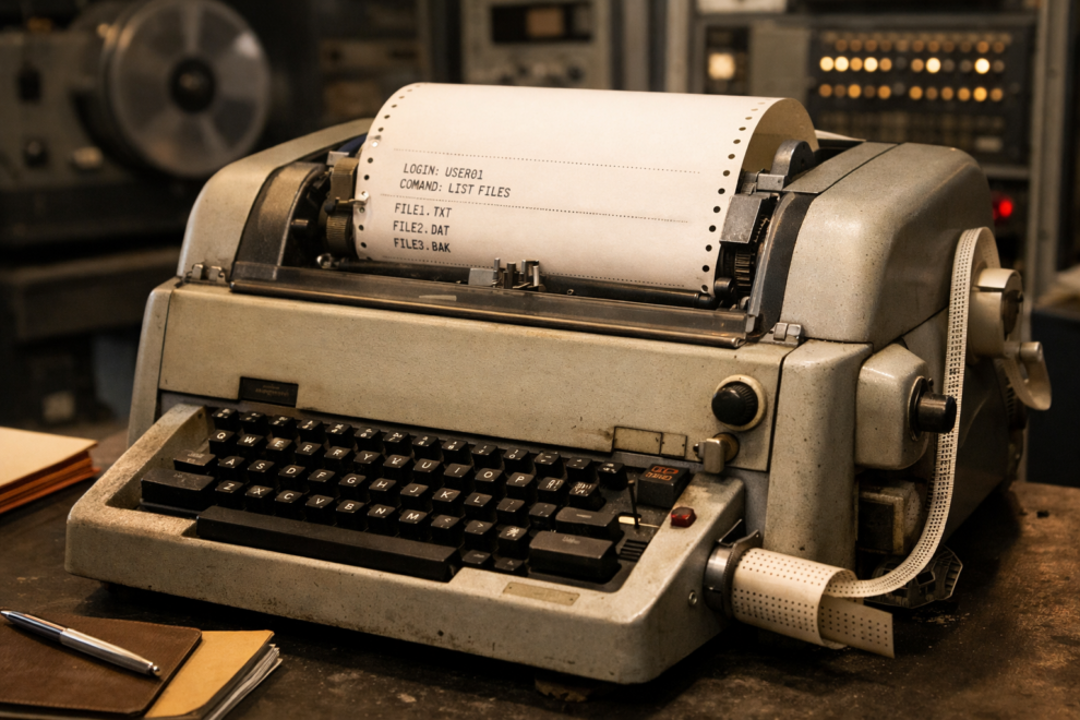 Los teletipos —o TTY— no mostraban texto en una pantalla, lo imprimían. Cada carácter, cada salto de línea, cada error… Todo quedaba registrado en papel continuo, como si el ordenador tuviera la manía de no fiarse de la memoria y necesitara dejar constancia física de todo lo que decía.